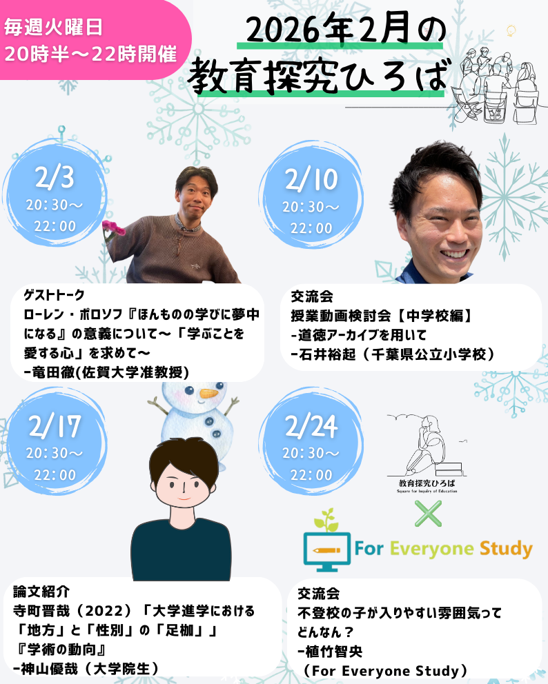 2月24日 交流会「不登校の子が入りやすい雰囲気ってどんなん?」ー植竹智央(For Everyone Study)
