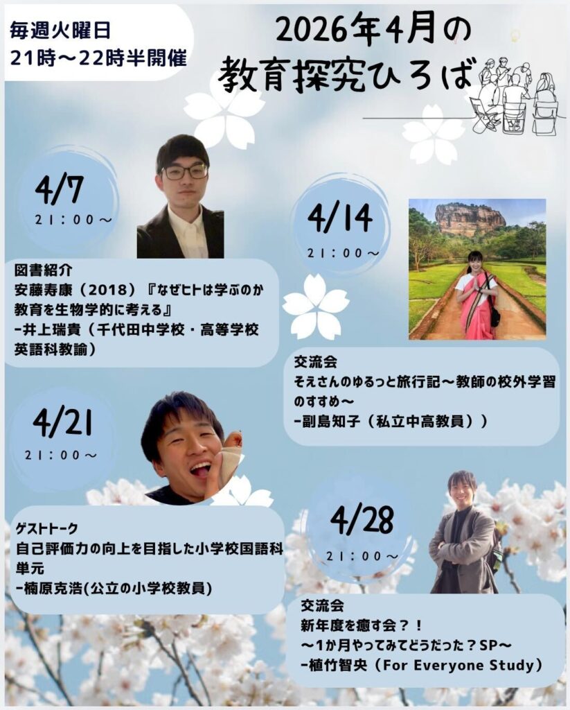 具体的には、毎週火曜日の21:00から22:00までオンラインで対話会をしています。会の形式は、研究紹介、実践紹介を基本としつつ、模擬授業、交流会、対談、シンポジウムなど面白いと思う会は積極的に開催しています。また、そのテーマも教授学習、認知、授業論、哲学・思想、歴史、ICT、特別支援など、会ごとに多様です。