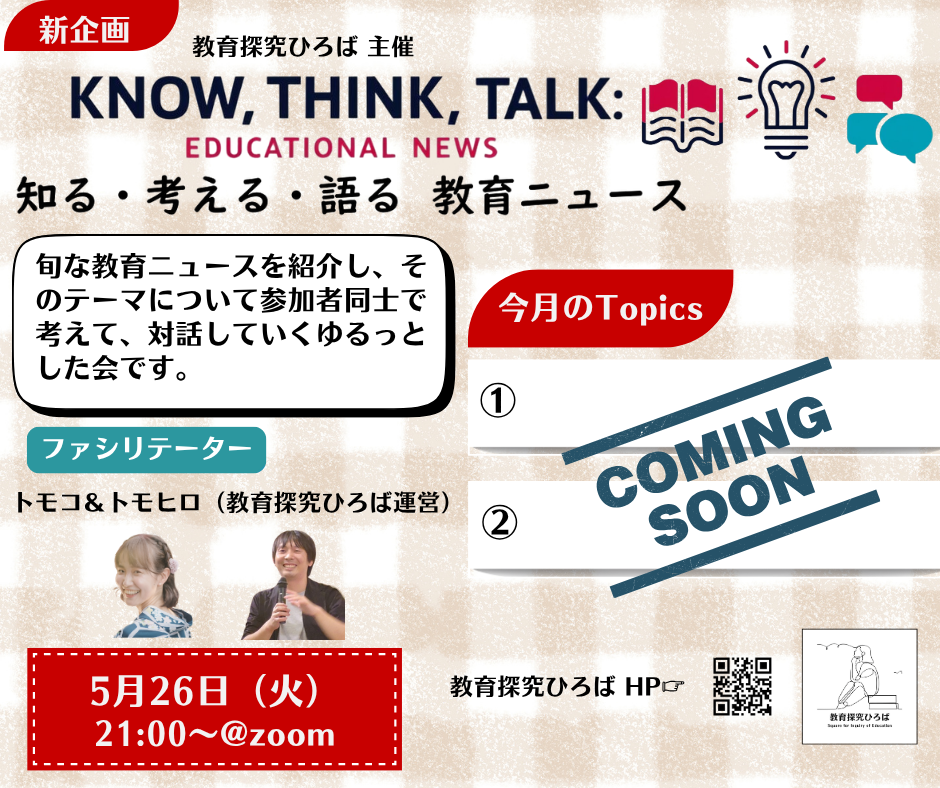 教育探究ひろば主催「知る・考える・語る 教育ニュース」は、ファシリテーターが旬な教育ニュースを3つほど紹介し、それについて皆さんと対話する会です。毎回テーマを変え、2か月に1度開催します。
